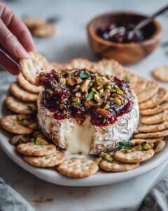 For special occasions, I place the baked brie on a wooden board surrounded by a ring of fresh herbs, cranberries, and nuts. It’s an inviting centerpiece that invites guests to help themselves. You can also stuff the brie inside puff pastry for a luxurious twist, but honestly, keeping it simple with cranberry sauce is my favorite way.