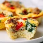 These Baked Egg Cups are a delicious and convenient breakfast option featuring fluffy eggs combined with savory ground pork sausage, fresh spinach, and crisp red bell pepper. Baked to perfection in a muffin tin, they make a great on-the-go meal or meal prep idea that’s high in protein and full of flavor.