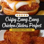 Delicious and crispy Bang Bang Chicken Sliders featuring thinly sliced breaded chicken breasts fried to perfection, topped with melted mozzarella, and served on soft slider rolls with a flavorful Bang Bang sauce.