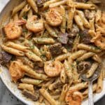A rich and flavorful Blackened Steak and Shrimp Alfredo featuring perfectly seasoned and seared top sirloin steak and shrimp served over al dente penne pasta in a creamy parmesan and blackened spice sauce.