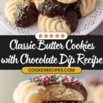 Classic Butter Cookies featuring soft, buttery swirls partially dipped in rich chocolate and decorated with festive holiday sprinkles. These melt-in-your-mouth cookies are perfect for Christmas celebrations and are made with simple ingredients like butter, sugar, and vanilla or almond extract for a deliciously tender treat.