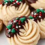 Classic Butter Cookies featuring soft, buttery swirls partially dipped in rich chocolate and decorated with festive holiday sprinkles. These melt-in-your-mouth cookies are perfect for Christmas celebrations and are made with simple ingredients like butter, sugar, and vanilla or almond extract for a deliciously tender treat.