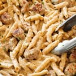 - Assemble the pasta bake: Add the cooked pasta and Alfredo sauce to the skillet with the chicken and toss to combine thoroughly. Transfer the mixture into a greased 13 x 9-inch baking dish. Sprinkle the top with the remaining 1/2 cup of shredded cheddar cheese.