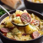 This hearty Cajun Potato Soup is a flavorful blend of spicy and creamy elements, featuring browned andouille sausage, tender potatoes, and a medley of sautéed vegetables. Enhanced with a rich combination of Cajun spices, cheddar cheese, and heavy cream, this comforting soup delivers a perfect balance of smoky, spicy, and creamy textures. Garnished with fresh parsley, it’s an ideal warming meal for any occasion.