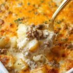 A hearty and comforting cheesy ground beef and potato casserole, featuring tender russet potatoes, seasoned ground beef with mixed vegetables, all baked in a creamy mushroom sauce and topped with melted cheddar cheese. Perfect for family dinners and easy to prepare.