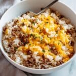 - Assemble the casserole: In your prepared baking dish, combine the cooked white rice, the beef and onion mixture, half of the shredded cheddar cheese, and the prepared sauce. Mix everything thoroughly to ensure even distribution of flavors.