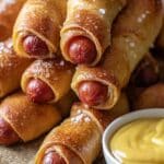 Pretzel Dogs are a delicious and fun snack featuring savory sausage franks wrapped in soft, chewy pretzel dough. These homemade treats boast a golden-brown crust sprinkled with kosher salt, making them perfect for parties, game days, or a satisfying meal. The process includes boiling the dough-wrapped sausages in a baking soda bath to achieve the iconic pretzel texture before baking to perfection.