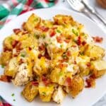 - Marinate chicken: While potatoes bake, mix the cubed chicken breasts with the remaining ¼ cup ranch dressing and a pinch of salt and pepper. Let it marinate while the potatoes cook.