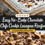 This Cookie Lasagna is a decadent no-bake dessert featuring layers of large soft-batch chocolate chip cookies, creamy sweetened cream cheese, and whipped topping. Garnished with cookie crumbles and mini chocolate chips, it’s perfect for parties or a delightful treat chilled to perfection.