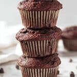 Deliciously moist and chocolatey Double Chocolate Chip Cottage Cheese Muffins made with protein powder, coconut sugar, and cottage cheese for a soft, tender crumb. These muffins are perfect as a healthy breakfast or snack with a rich chocolate flavor and gooey chocolate chips in every bite.
