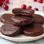 Delightfully sweet and tangy jellied cranberry sauce slices coated in smooth dark chocolate, creating a perfect bite-sized holiday treat that balances fruity tartness with rich chocolate flavor.