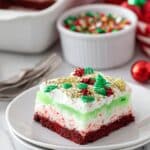 This festive Christmas Lasagna Dessert layers moist red velvet cake, a creamy cream cheese mixture with crushed candy canes, a vibrant green vanilla pudding, and fluffy Cool Whip, creating a delightful no-bake holiday treat perfect for gatherings. The dessert combines classic holiday flavors with a fun, colorful presentation and is chilled to perfection for a refreshing finish.