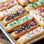 These festive Christmas White Chocolate-Dipped Sugar Wafers are a delightful holiday treat featuring crispy sugar wafer cookies dipped in creamy white chocolate coating and adorned with colorful red, green, and white sprinkles. They are easy to make, require no baking, and perfect for gifting or serving at holiday parties.