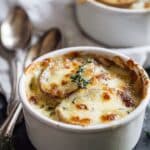 This classic French Onion Soup recipe features slowly caramelized onions simmered in a rich beef broth, topped with toasted crusty French bread and melted Gruyere and mozzarella cheeses. Perfect as a comforting appetizer or a hearty meal, this soup combines deep, sweet onion flavors with a cheesy, golden crust.