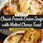 This classic French Onion Soup recipe is a rich and comforting dish featuring slowly caramelized onions simmered in a flavorful broth, topped with toasted French bread and melted Gruyere, Mozzarella, and Parmesan cheeses. Perfect as a starter or a hearty meal, it combines sweetness from the onions with a savory, cheesy crust that’s broiled to golden perfection.