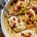 This Easy Creamy Pepperoncini Chicken recipe features tender seared chicken breasts simmered in a rich, tangy, and dairy-free creamy sauce loaded with pickled pepperoncinis, garlic, and crispy bacon. Perfectly balanced with Italian seasoning and smoked paprika, this comforting skillet meal is quick to prepare and ideal for serving over gluten-free pasta, rice, or roasted vegetables.