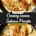 This Creamy Salmon Piccata is a quick and elegant skillet-cooked dish featuring tender salmon fillets in a luscious lemon-caper cream sauce. Perfect for a weeknight dinner or special occasion, the seared salmon is finished in a flavorful, velvety sauce made with butter, olive oil, chicken broth, lemon, capers, and heavy cream, garnished with fresh parsley for a bright finish.