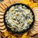 - Season and Serve: Once cooked, stir the dip again and taste. Adjust the seasoning by adding salt and pepper as needed. Serve the warm spinach artichoke dip with your choice of crackers or chips for dipping.
