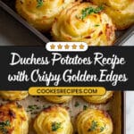 Duchess Potatoes are a classic French-inspired side dish featuring creamy, fluffy mashed potatoes piped into elegant swirls and baked to golden perfection. Made with Russet or Yukon Gold potatoes, butter, heavy cream, Parmesan cheese, and egg yolks, these crispy-edged and tender-centered potato rosettes add a gourmet touch to any meal.