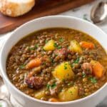Potaje de Lentejas is a hearty Cuban lentil soup featuring smoky ham shanks, tender lentils, potatoes, and pumpkin simmered in flavorful broth with aromatic spices. This traditional stew offers a comforting and nutritious meal, perfect for any occasion.
