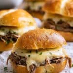 These Crockpot French Dip Sandwiches feature tender, slow-cooked beef chuck roast infused with savory flavors, served on toasted hoagie rolls with melted provolone cheese and flavorful au jus for dipping. Perfect for a comforting and easy meal with minimal hands-on time.