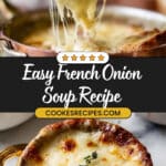 This easy French Onion Soup recipe features deeply caramelized onions simmered in rich beef broth, deglazed with white wine, and topped with toasted baguette slices and melted Gruyère cheese. It’s a comforting classic, perfect for cozy dinners and impressing guests with minimal effort.