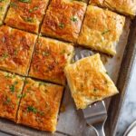- Complete the Phyllo Layers: Continue layering the remaining phyllo sheets on top of the meat filling, brushing each set of sheets with the oil mixture until all phyllo dough is used. Using a knife, cut the assembled pie into squares or diamond shapes for easier serving.