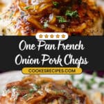 This One Pan French Onion Smothered Pork Chops recipe features tender pork chops cooked alongside caramelized onions in a rich beef stock gravy, topped with melted provolone and Gruyere cheese for a comforting and flavorful meal prepared entirely in one skillet.