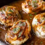 This One Pan French Onion Smothered Pork Chops recipe features tender pork chops cooked alongside caramelized onions in a rich beef stock gravy, topped with melted provolone and Gruyere cheese for a comforting and flavorful meal prepared entirely in one skillet.
