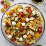 - Assemble the Pasta Salad: In a large serving bowl, either layer or toss together the cooked pasta, grilled chicken chunks, halved tomatoes, fresh mozzarella, and chopped basil. Layering involves arranging ingredients in layers for presentation, while tossing mixes everything evenly.