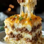 Cattle Drive Casserole is a hearty, layered dish perfect for family dinners or potlucks. Featuring a savory ground beef and vegetable base seasoned with taco spices, a biscuit crust baked to golden perfection, and creamy layers of sour cream, mayonnaise, and cheese, this casserole combines comforting flavors with easy preparation. Topped with salsa and melted cheese, it’s a satisfying bake that’s warm and inviting.