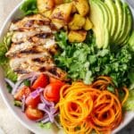 This 15-minute Hawaiian Chicken Salad Bowl combines juicy grilled chicken marinated in tropical flavors with fresh romaine, creamy avocado, and roasted spiralized sweet potatoes. Finished with a tangy pineapple dressing and grilled pineapple chunks, it delivers a vibrant, healthy, and satisfying meal perfect for a quick lunch or dinner.