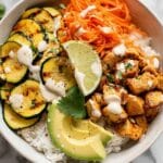 This Hot Honey Chicken and Rice Bowls recipe combines tender chicken breasts glazed with a sweet and spicy hot honey sauce, served over a bed of sautéed summer squash, zucchini, shredded carrots, and your choice of rice or quinoa. The dish is finished with creamy avocado slices, a zesty lime squeeze, and an optional healthy ranch drizzle for added flavor and creaminess. Perfectly balanced and easy to prepare, this recipe is ideal for a flavorful weeknight dinner.