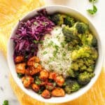 - Assemble the Bowls: To assemble each bowl, layer a base of cooked rice, followed by shredded purple cabbage, roasted broccoli, and the hot honey chicken on top.