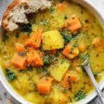 - For Instant Pot: Use the ‘Sauté’ function to cook onion, carrots, parsnips, celery, garlic, turmeric, and ginger as described. Then add broth, water, lentils, salt, and pepper. Cook on high pressure for 8 minutes. Quick release the pressure, then stir in kale, parsley, and lemon juice. Cover and let steam for 2 minutes before serving.