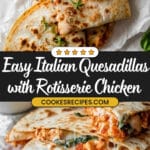 Italian Quesadillas combine the savory flavors of rotisserie chicken, fresh basil, mozzarella cheese, and pizza sauce nestled between warm, crispy tortillas. This easy-to-make recipe offers a delightful fusion of Italian and Mexican cuisine, perfect for a quick lunch or dinner.