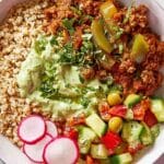 - Assemble and Serve: Divide the warmed cooked whole grains evenly among serving bowls. Top each bowl with a generous portion of the spiced ground beef mixture. Drizzle with harissa oil if using, followed by tahini sauce or creamy feta dressing. Garnish with the prepared vegetables, sliced radishes, fresh herbs (cilantro or parsley), and pitted Castelvetrano or kalamata olives. Serve any remaining sauces, veggies, and olives alongside for guests to customize their bowls.