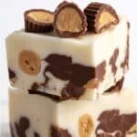 - Layer the Fudge: Pour about two-thirds of the vanilla fudge into a non-stick tin foil-lined 8-inch square baking pan and spread evenly. Pour two-thirds of the chocolate ganache over the vanilla layer and use a toothpick or skewer to swirl the chocolate into the vanilla fudge. Sprinkle 1 cup of mini peanut butter cups evenly over the top.