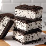 Delicious homemade Oreo Ice Cream Sandwiches featuring a crunchy Oreo crust base and topping with a creamy vanilla Oreo ice cream filling. These no-bake treats are easy to make and perfect for freezing and enjoying as a cool dessert.