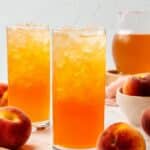 - Assemble the Iced Peach Sweet Tea: Once the peach syrup is cooled and the tea base is cooled or at room temperature, combine both by stirring the syrup into the tea thoroughly. Add ice directly into the pitcher or into individual glasses, then pour the peach tea over the ice. Serve immediately and enjoy!