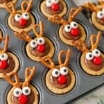 - Decorate reindeer features: Break pretzels in half to create antlers. Place two pretzel halves on each peanut butter cup head. Then add one M&M as the nose and two candy eyes or mini chocolate chips for eyes on each cookie.