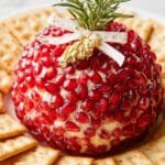 A festive and creamy Pomegranate Christmas Cheese Ball perfect for holiday parties. This cheese ball features a blend of cream cheese, shredded white cheddar, and savory garlic and green onions, coated generously with fresh pomegranate arils for a colorful, crunchy exterior. Garnished with a Rolo candy and rosemary sprig, it serves beautifully with crackers and veggie slices, offering a delightful combination of flavors and textures.