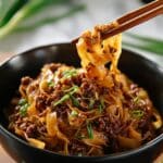 A flavorful and easy-to-make Potsticker Noodle Bowl featuring wide Lo Mein noodles, savory ground pork, and a tangy, spicy sauce. This dish combines Asian-inspired ingredients with fresh coleslaw mix for a quick and satisfying meal perfect for weeknights.