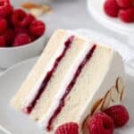 This Raspberry Almond Cake features moist white almond cake layers filled with a luscious, seedless raspberry filling and whipped shortcut Swiss meringue buttercream. The delicate balance of almond and vanilla extracts enhances the flavor, while fresh raspberries and slivered almonds on top add texture and visual appeal. Perfect for special occasions or an elegant dessert.