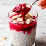 - Assemble and serve: Divide the chilled chia pudding evenly into two small glasses or jars. Pour the cooled raspberry sauce over the pudding. Finish by sprinkling almond flakes on top for a satisfying crunch. Serve immediately or keep refrigerated until ready to eat.