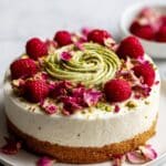 This Single Layer Raspberry Rose Pistachio Cake is a delicate and fragrant treat combining the nutty richness of pistachios, almonds, and coconut with the floral notes of rose water and cardamom. Topped with a smooth rose and vanilla bean buttercream, fresh raspberries, candied rose petals, and pistachio butter, this cake offers a beautiful balance of flavors and textures perfect for any special occasion or afternoon tea.