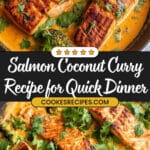 A vibrant and creamy Salmon Coconut Curry featuring tender salmon pieces simmered in a rich Thai red curry and coconut milk sauce, accented with fresh herbs and crisp vegetables for a delightful and comforting meal.