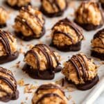 Delicious and easy-to-make Samoa Truffles featuring a luscious blend of shredded coconut, dulce de leche, sweetened condensed milk, and crushed Nilla Wafer cookies, all coated in rich dark chocolate. These bite-sized treats capture the classic flavors of Samoa cookies in a fun, truffle form perfect for holiday gifting or anytime indulgence.