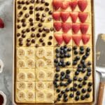 This Quick and Easy Sheet Pan Pancakes recipe offers a fun and effortless way to make a large batch of fluffy pancakes with a variety of delicious toppings all baked together in one pan. Perfect for family breakfasts or brunch gatherings, these pancakes are baked in the oven, eliminating the need for flipping individual pancakes on the stovetop. Enjoy a delightful mix of strawberries, bananas, chocolate chips, and blueberries with a sweet sprinkle of sugar on top, served warm with maple syrup.