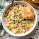 A comforting Slow Cooker Chicken Pot Pie Soup filled with tender chicken, hearty potatoes, mixed vegetables, and a rich, flavorful sauce, finished with a touch of cream. Perfectly paired with buttery homemade or store-bought biscuits for a cozy meal.
